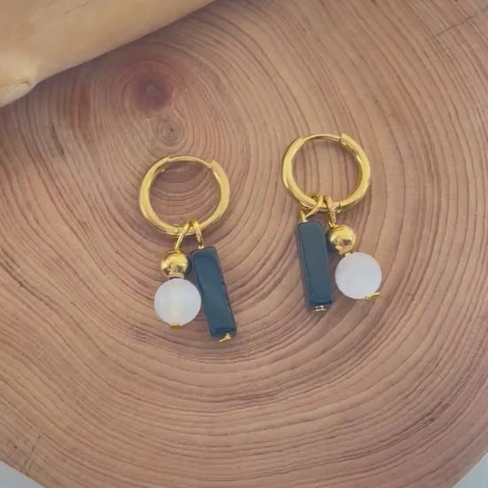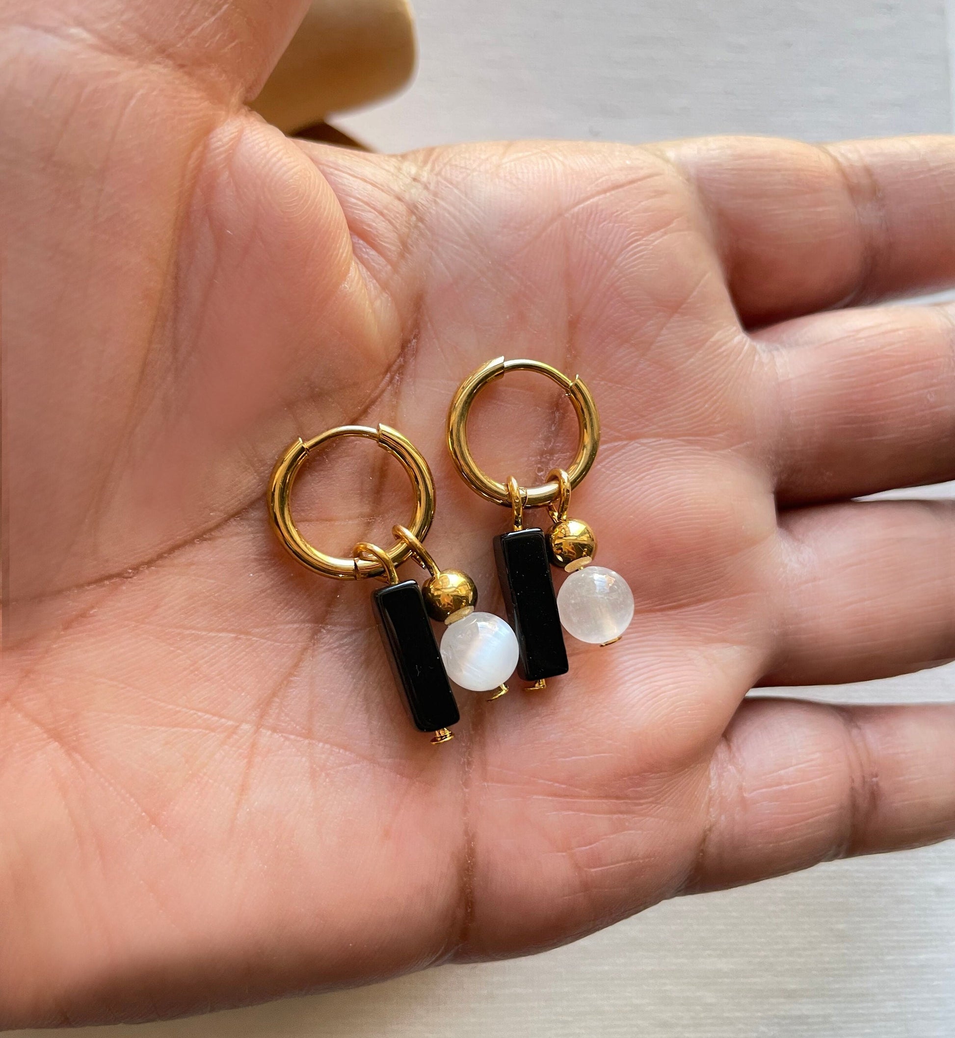 Selenite ~ Obsidian Minimalist Crystal Gold Huggie Earrings